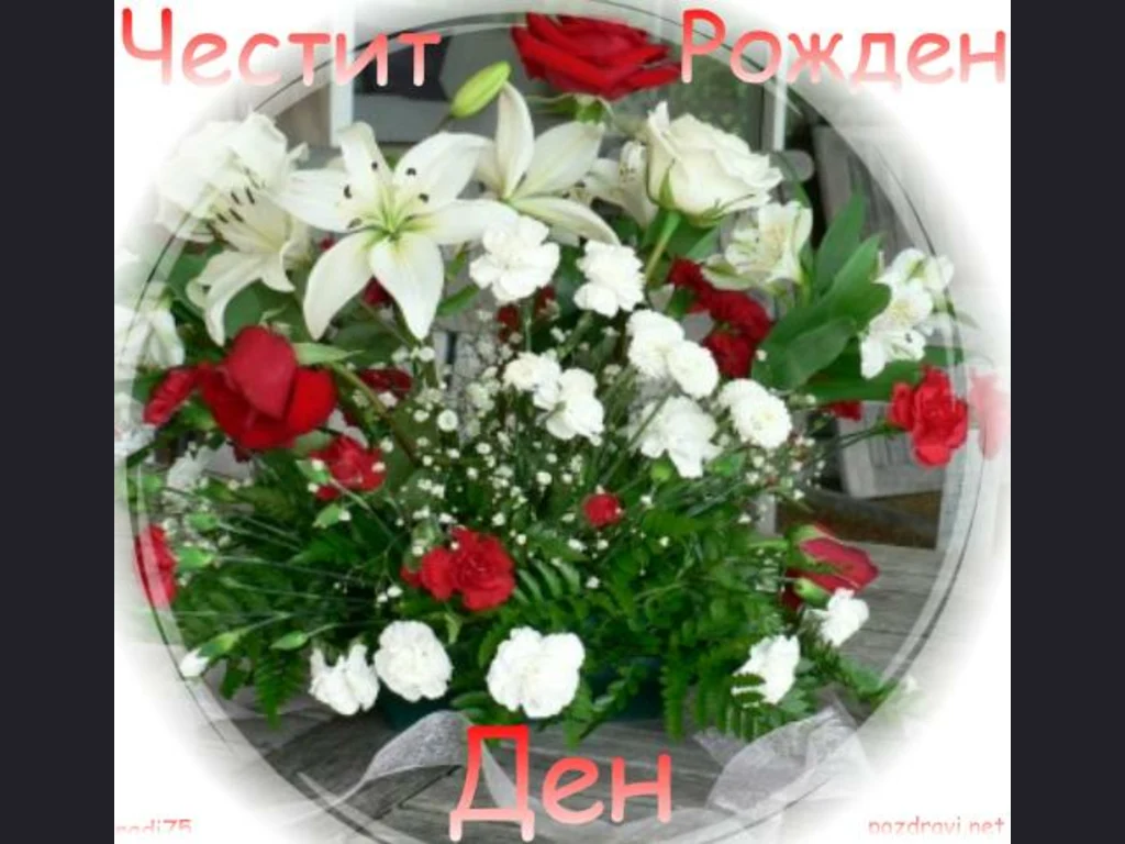 Ключови фрази: Картичка поздрави алено червени рози камелии бели карамфили папрат рожден ден