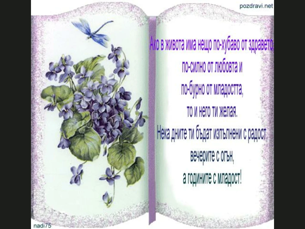 Поздрави за рожденици. Пожелания за рожден ден. Ако в живота има нещо по-хубаво от здравето, по-силно от любовта и по-бурно от младоста, то и него ти желая. Нека дните ти бъдат изпълнени с радост, вечерите с огън, а годините с младост!