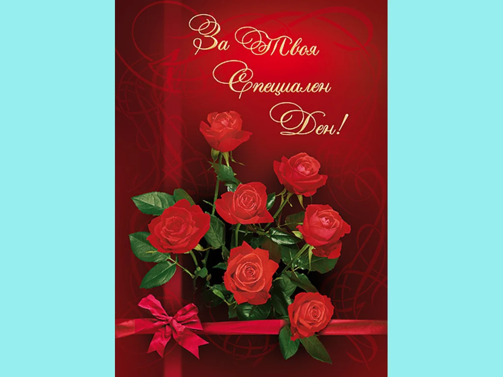 Ключови фрази: Червена картичка алени разцъвнали рози панделка изящество стил поздрави пожелание рожден ден