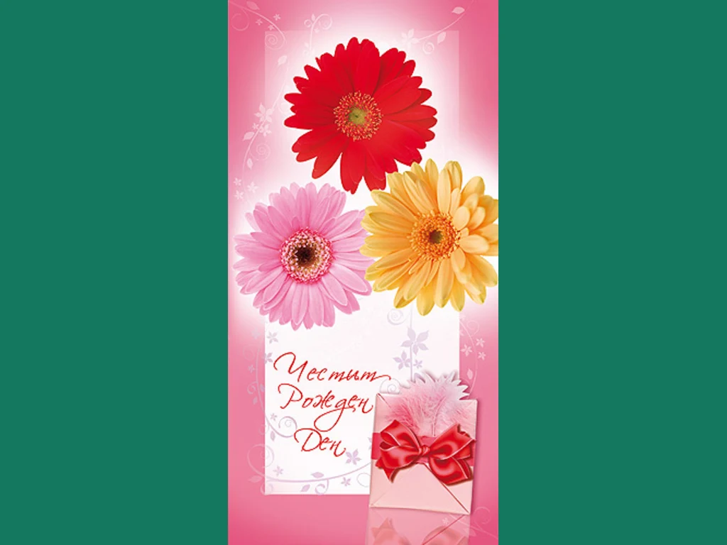 Ключови фрази: Розов фон разноцветни гербери поздрави пожелание плик сатенена панделка изисканост рожден ден