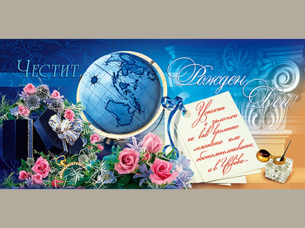 Ключови фрази: Картичка поздрави рожден ден успех време будилник човек рози панделки букети писалка мастилница глобус подарък пожелание