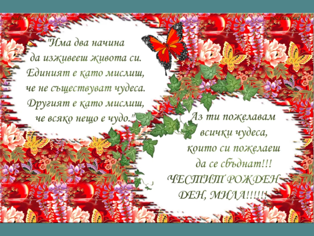 Ключови фрази: Картичка рисувана пъстра красива пеперуди цветя рожден ден възраст чудеса поздрави пожелание