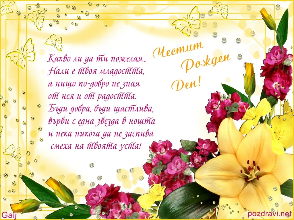 Ключови фрази: Много красива слънчева изящна картичка пожелание рожден ден жена цветни клонки цикламени жълти цветя пеперуди перли диаманти младост радост смях щастие любов