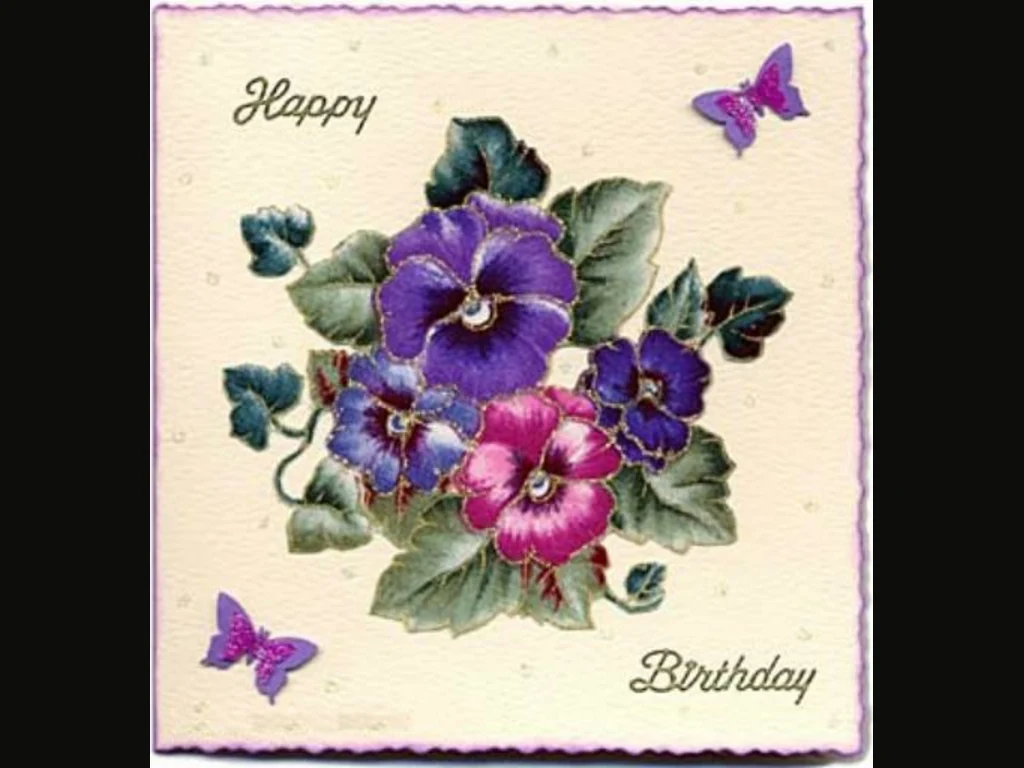 Ключови фрази: Рисувана картичка красив букет теменуги пеперуди поздрави щастлив рожден ден