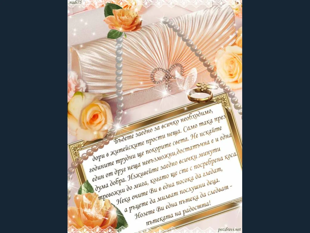 Ключови фрази: Сватба халки поздрав пожелание цветя рози перли наниз злато диаманти рубини бяла коприна сатен воал
