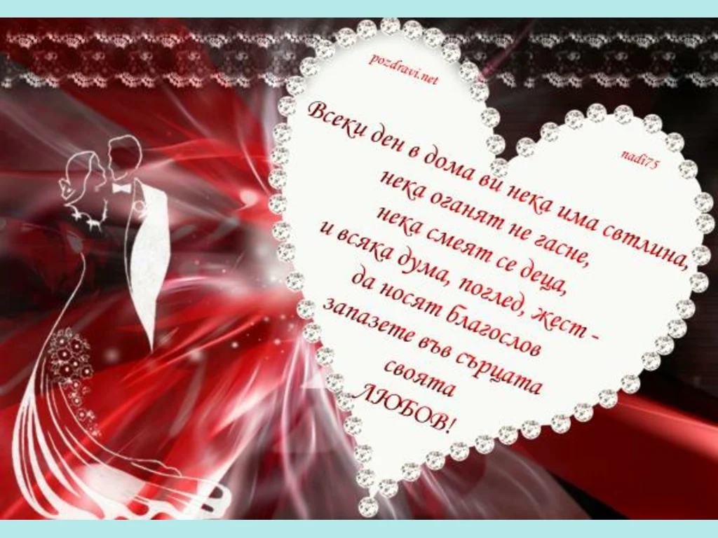 Ключови фрази: Сватба булка младоженец първи танц покана картичка пожелания тост поздрав пръстени брак семейство щастие красива булченска рокля поздравления любов семейно щастие