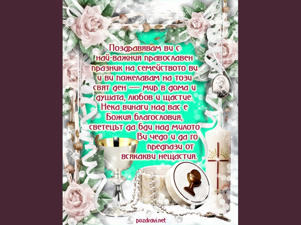Поздравявам ви с най-важния православен празник на семейството ви и ви пожелавам на този свят ден — мир в дома и душата, любов и щастие. Нека винаги над вас е Божия благословия, светецът да бди над милото ви чедо и да го предпази от всякакви нещастия.