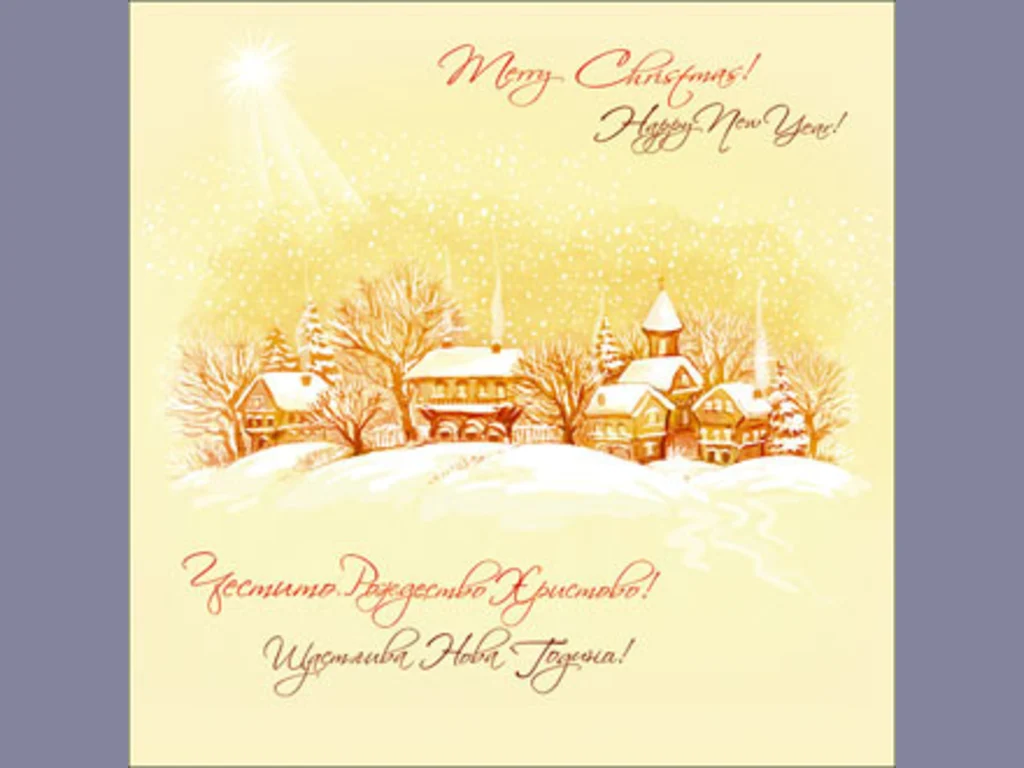 Ключови фрази: Щастлива нова година честито рождество Христово картичка пожелание поздрави снежно отрупани къщички сгушени семеен домашен уют снежинки