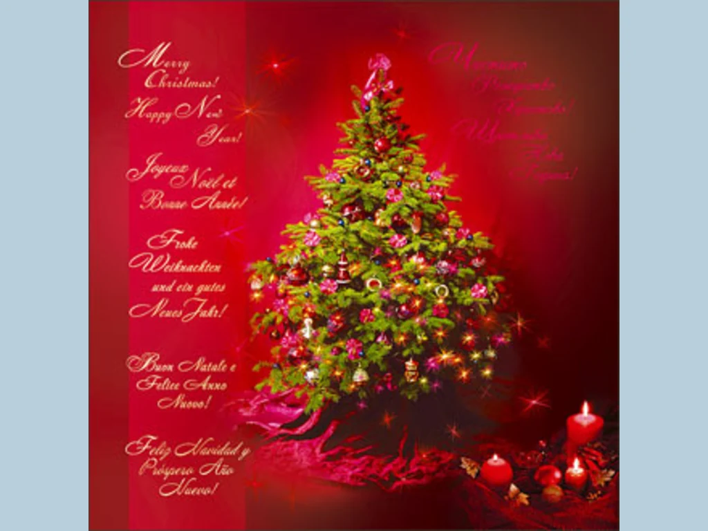 Ключови фрази: Красива украсена коледна елха горящи червени свещи пламъчета звездички картичка вишнево пожелание поздрави