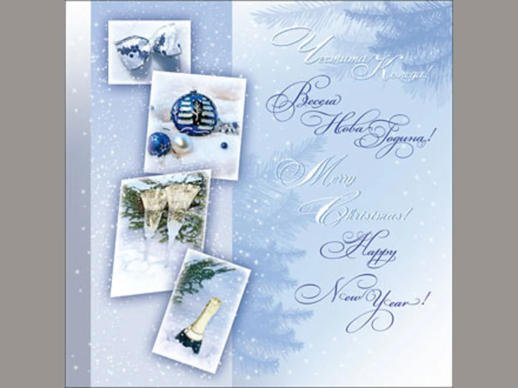 Ключови фрази: Картичка пожелания поздрави пълни чаши бутилка шампанско папионка новогодишна украса играчки весела коледа борови клонки
