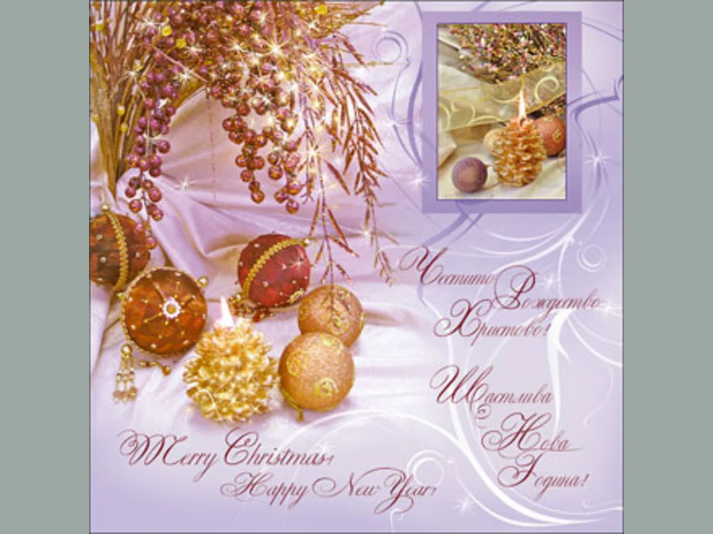 Ключови фрази: Картичка пожелание поздрави борови клонки панделка шишарки запалена коледна свещ перлички звездички честито рождество христово щастлива нова година