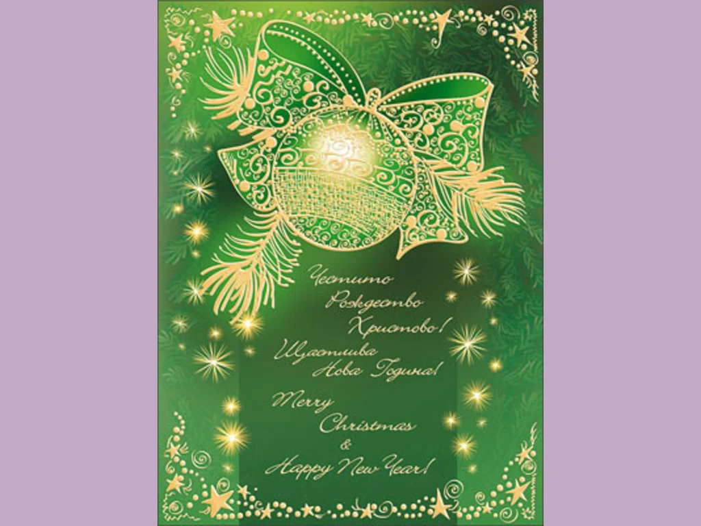 Ключови фрази: Празнична зелена картичка новогодишни играчки коледни украси звездички поздрави пожелание любов щастие късмет благополучие