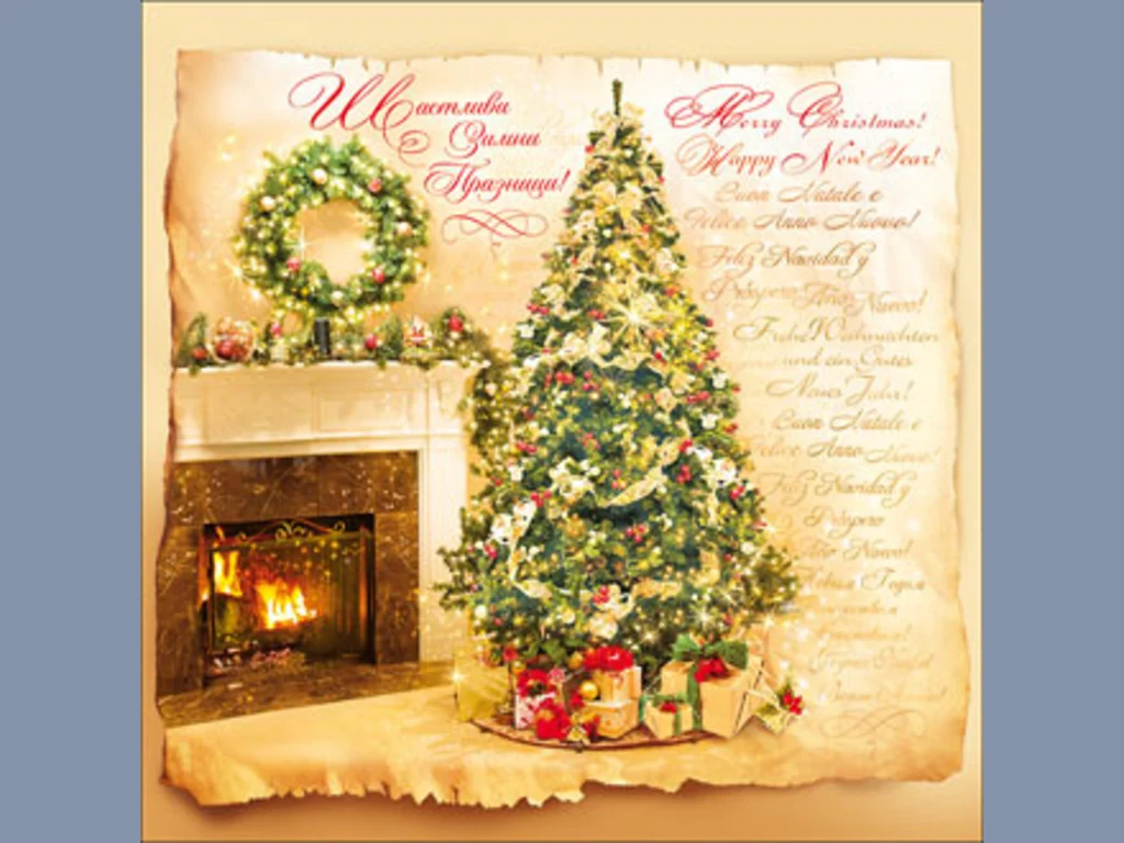 Ключови фрази: Картичка пожелание поздрави честито рождество Христово коледно новогодишни играчки украса елха клонки свещи пламъче панделка звездички любов късмет семеен празник дом уют камина топлина