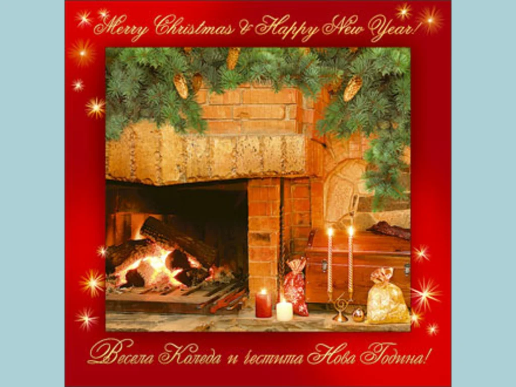 Ключови фрази: Картичка весела коледна нощ горяща камина жарава запалени свещи пламъчета подаръци борови клонки шишарки щастлива нова година