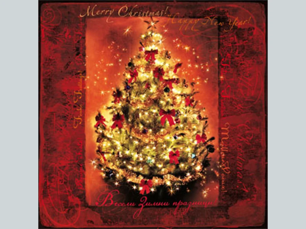Ключови фрази: Неотразима светеща сияйна коледна елха звезда червени панделки картичка пожелание поздрави зимни празници
