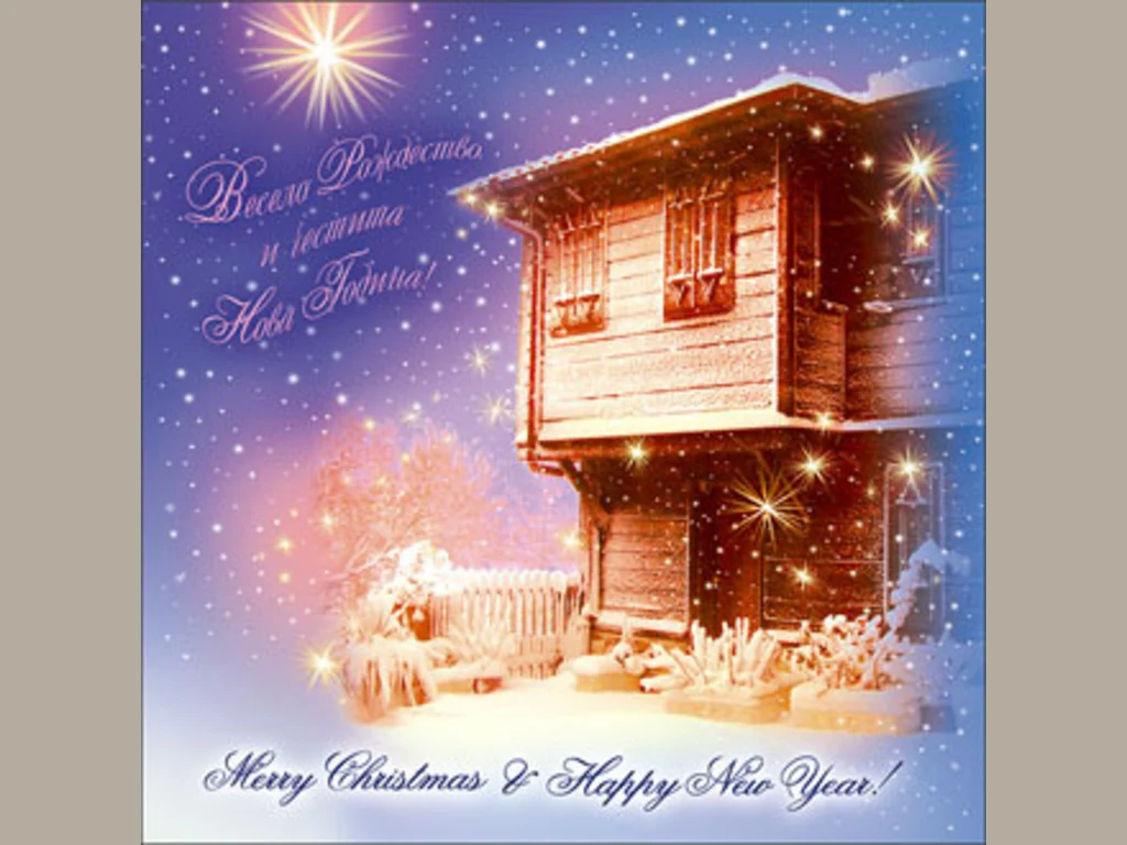 Ключови фрази: Картичка пожелание поздрави весело рождество щастлива нова година коледна звезда сияйна къща отрупана сняг снежинки вълшебна нощ семеен празник