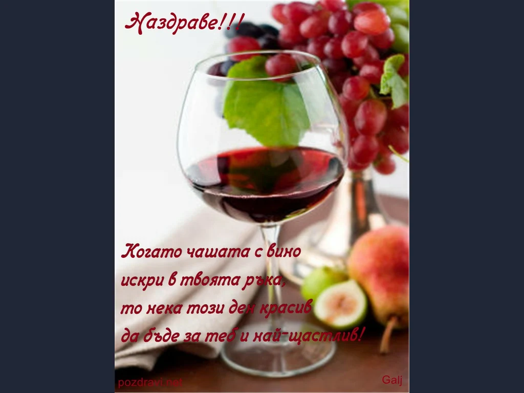 Ключови фрази: Картичка чаша червено вино плодове грозде честит празник поздрави пожелание щастие