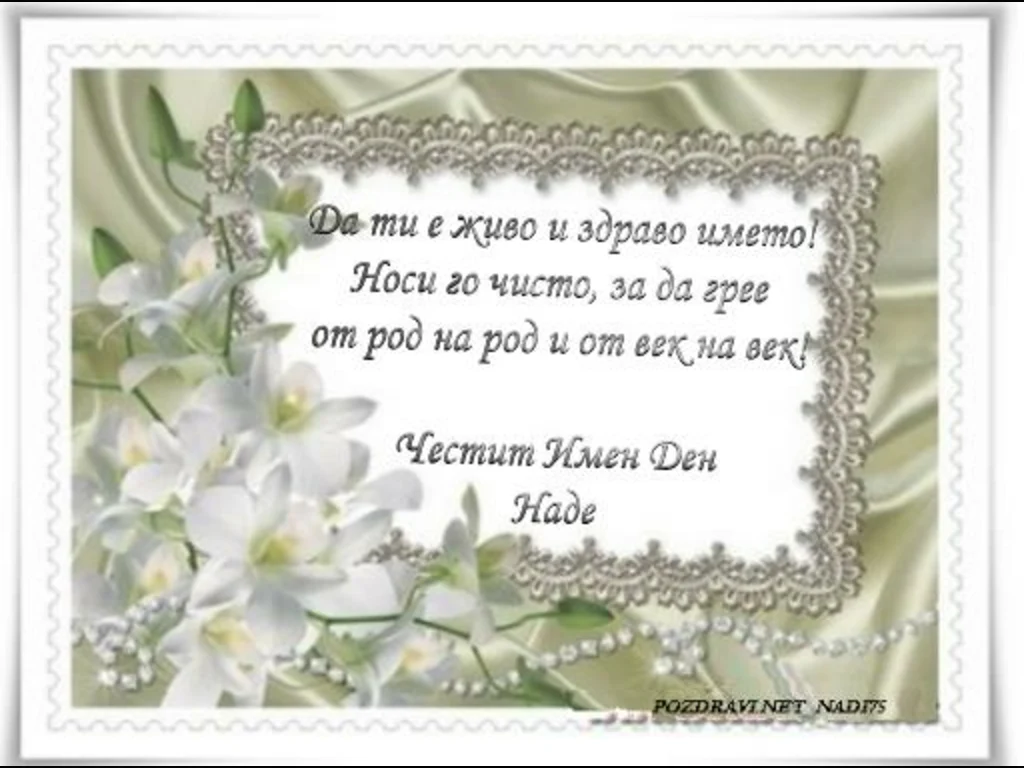 Ключови фрази: Картичка цветя бели скъпоценни камъни красота изисканост пожелание поздрави имен ден Надка Наде Нади Надежда Надина