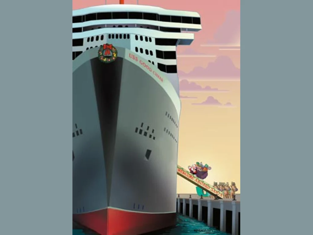 Ключови фрази: Дядо Коледа картичка елени кораб пристанище пътешествие шейна скеч забавна смешна комикс рисувана