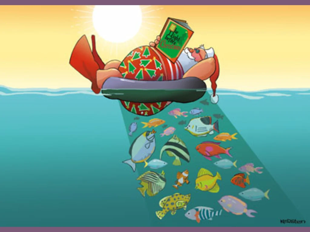 Ключови фрази: Дядо Коледа пояс вода почивка плаж рибки екзотика море картичка елени еленчета шейна скеч забавна смешна комикс рисувана